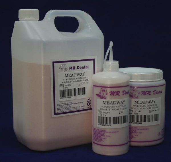 Supercure is a high quality denture base, with excellent flow characteristics. Good tensile strength and even colour stability. Curing time: 20 minutes in boiling water. Use with Meadway Universal Monomer. Shades: Translucent, Standard, Light Pink or Dark Pink, with or without veins. Sizes: 450gm, 1kg, 3kg, and 10kg.
